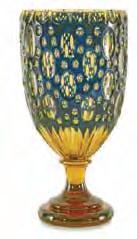 Maitland Smith’s Blue crystal vase features hand-beveled designs that reveal an amber crystal interior. The blue color transitions to a warm amber at the stem. (kdrshowrooms.com)