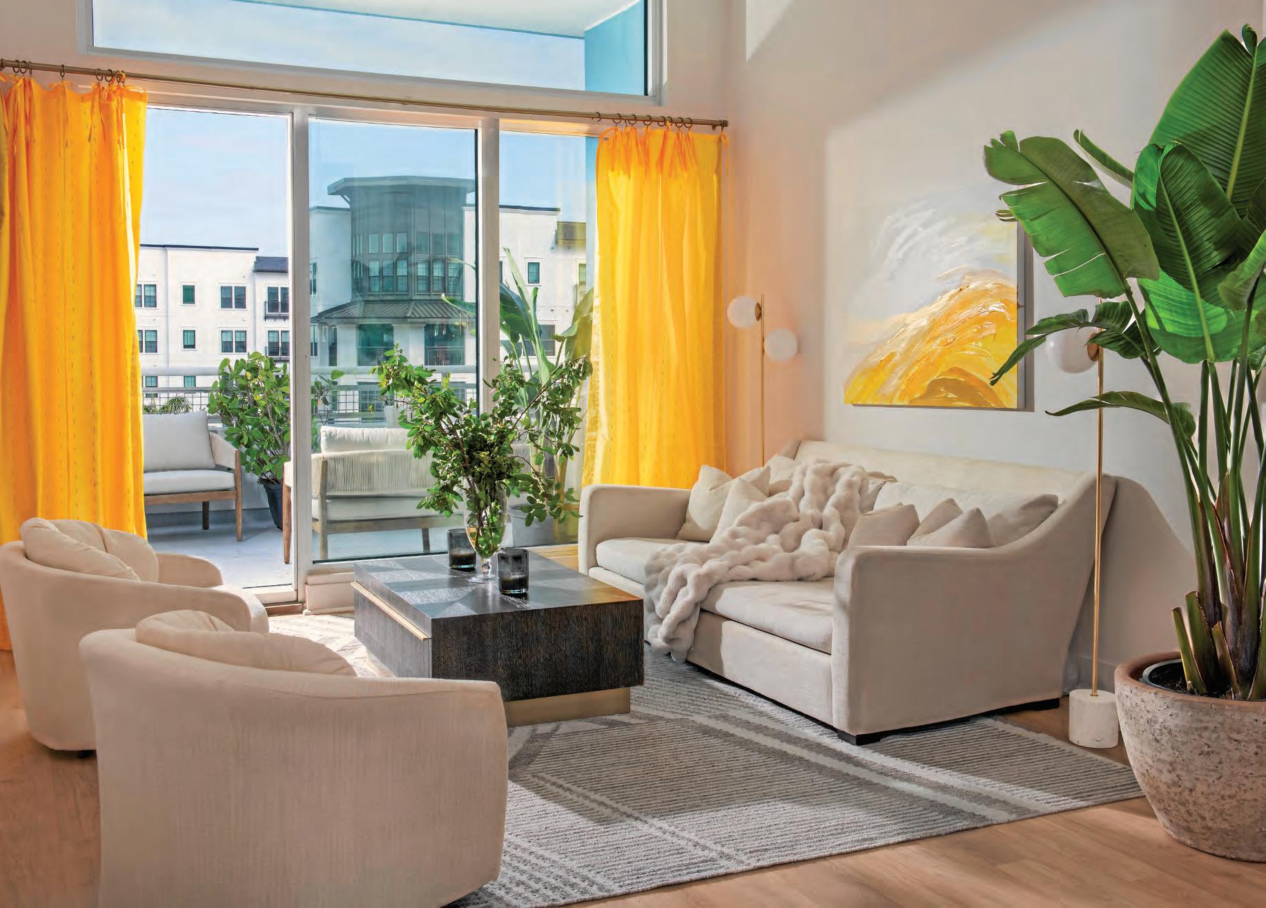 Blindauer thoughtfully curated striking, sculptural wicker chairs, towering birds-ofparadise, art and rich textures to truly transform the space.