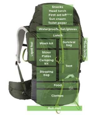 Middle–tent,stove,gas,sleepingbag(ifstuffinginbinbag). Top–Firstaidkit,packedlunch,toiletingsupplies.