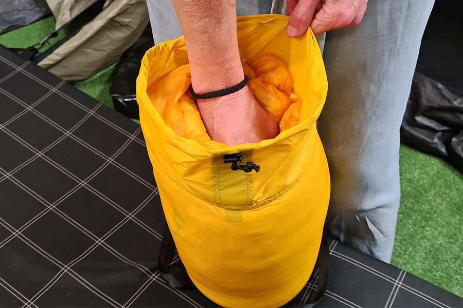 Atightlystuffedsleepingbagcanbealargeandinflexibleshape.Try looselyputtingitontooneofyourbinbags.Youwillthenbeableto stuffitintoallthelittleemptynooksandcranniesinyourrucksackand itwilltakeuplessspace.