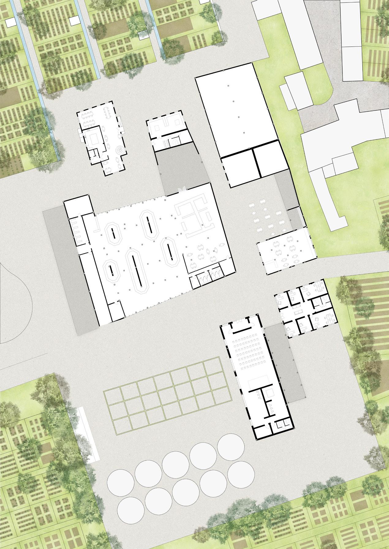 Yet the creek is not a mere figure, but it introduces a systemic vision regarding the storage and drainage of fresh water on the polders together with a system of adjacent ponds. Along it, several activities get reorganised.
