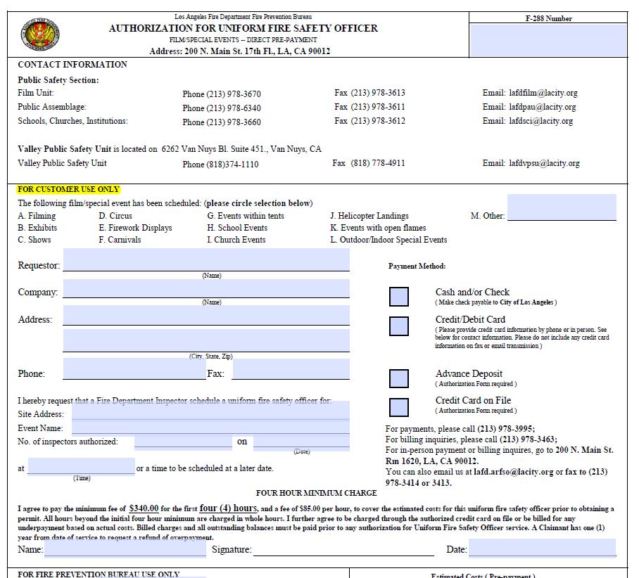 When direct payment to the LAFD is required for a Uniformed Fire Safety Officer (e.g. for an audience show, special event, drone use on studio lot, etc.), the form ‘LAFD FILM - Authorization for UFSO’ shall be completed and emailed to lafdfilm@lacity.org. Payment shall be received prior to the first date of the event. The subject line of the email shall state “UFSO Hire Request for [Insert Date of 1st Activity]”