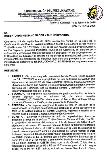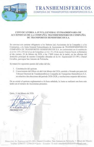 EXTRACTO DE PUBLICACION REGISTRO DE LA PROPIEDAD DEL CANTON ESMERALDAS.- Con fecha 12 de Enero del 2026, a las 16H21’, se presentó en ventanilla de al institución el escrito firmados por la señora Rocío Lazo Mera. Mediante el cual indica y solicita la Reposición de la escritura pública No. 833, de compraventa, celebrada el 27 de Noviembre de 1979.- que otorga la Ilustre Municipalidad de Esmeraldas.- a favor dela Señora Cesariana Mera De Lazo.- Relativo al solar No. 7, de la manzana No. 109, ubicado en la Avenida Seis de Diciembre, entre calles Salinas y Mejía, de la Parroquia Cinco de Agosto. Con una superficie de 261.30mts./2. Habiendo cumplido la peticionaria presentando lo solicitado, esto es la copia notariada de al escritura pública, es el admite el trámite, disponiendo que dentro de los tres días siguientes, se haga conocer al público mediante aviso efectuado en uno de los diarios de mayor circulación del cantón y de no haberlo, en uno de mayor circulación del país. A efecto de que cualquier persona interesada presente su oposición a al solicitud de reposición. Atentamente Abg. Edwin Guzmán Vélez Registrador de la Propiedad del Cantón Esmeraldas