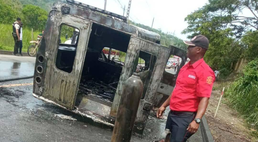 Una ambulancia de Eloy Alfaro se incendió en la vía a Esmeraldas tras una falla mecánica. Los ocupantes y el paciente fueron evacuados ilesos antes de que el fuego consumiera la unidad.