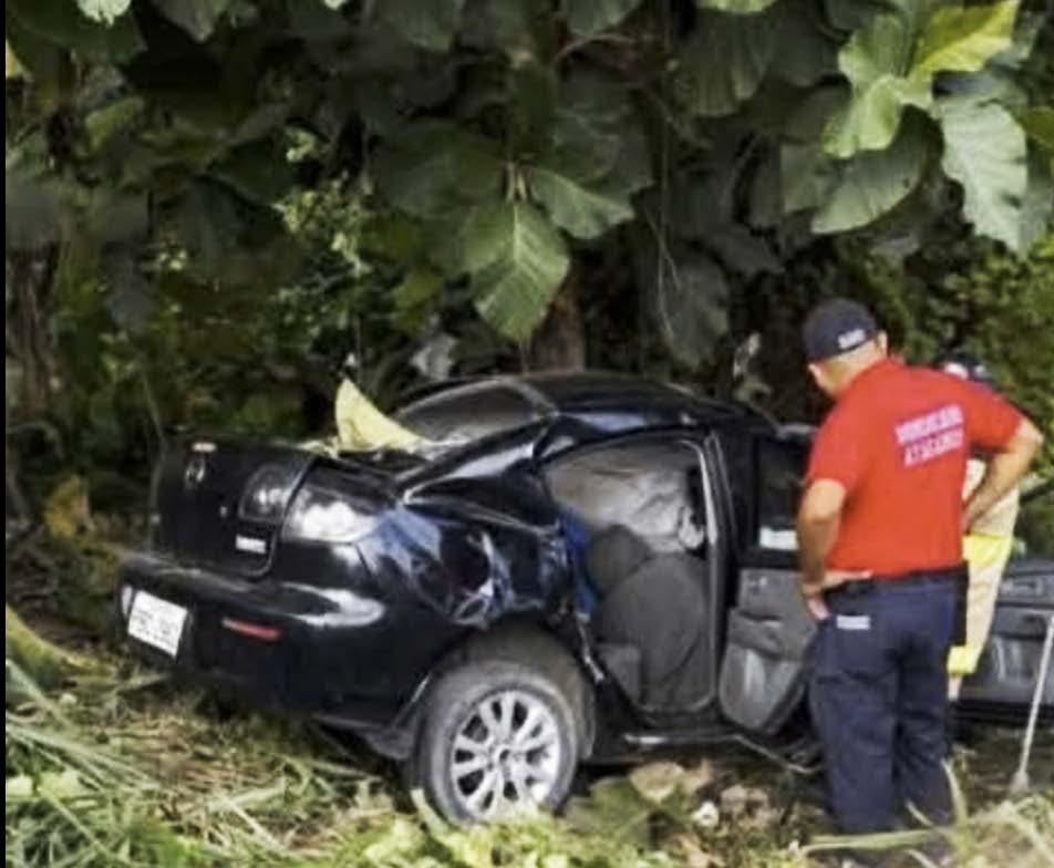 el incidente, custodiando el área durante los primeros minutos previos a la llegada de los agentes del orden. De acuerdo con la información recabada en el lugar de los hechos, el vehículo involucrado es un automóvil marca Mazda, de color negro, con placas de identificación P**-***2. La dinámica preliminar del suceso señala que el automotor perdió pista mientras circulaba por la carretera, lo que derivó en un fuerte impacto. Minutos después del reporte, efecti-