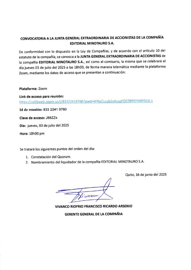 De conformidad con lo dispuesto en la Ley de Compañías, y de acuerdo con el artículo 13 del estatuto de la compañía, se convoca a la JUNTA GENERAL EXTRAORDINARIA DE ACCIONISTAS de la compañía EDITORES DE PRENSA ORGANIZADOS CRONICAS DE AMBATO E.D.I.E.P.O.C.A. SOCIEDAD ANONIMA, así como al comisario, la misma que se celebrará el día miércoles 02 de julio de 2025 las 17h30 pm, de forma manera telemática mediante la plataforma Zoom, mediante los datos de acceso que se presentan a continuación: