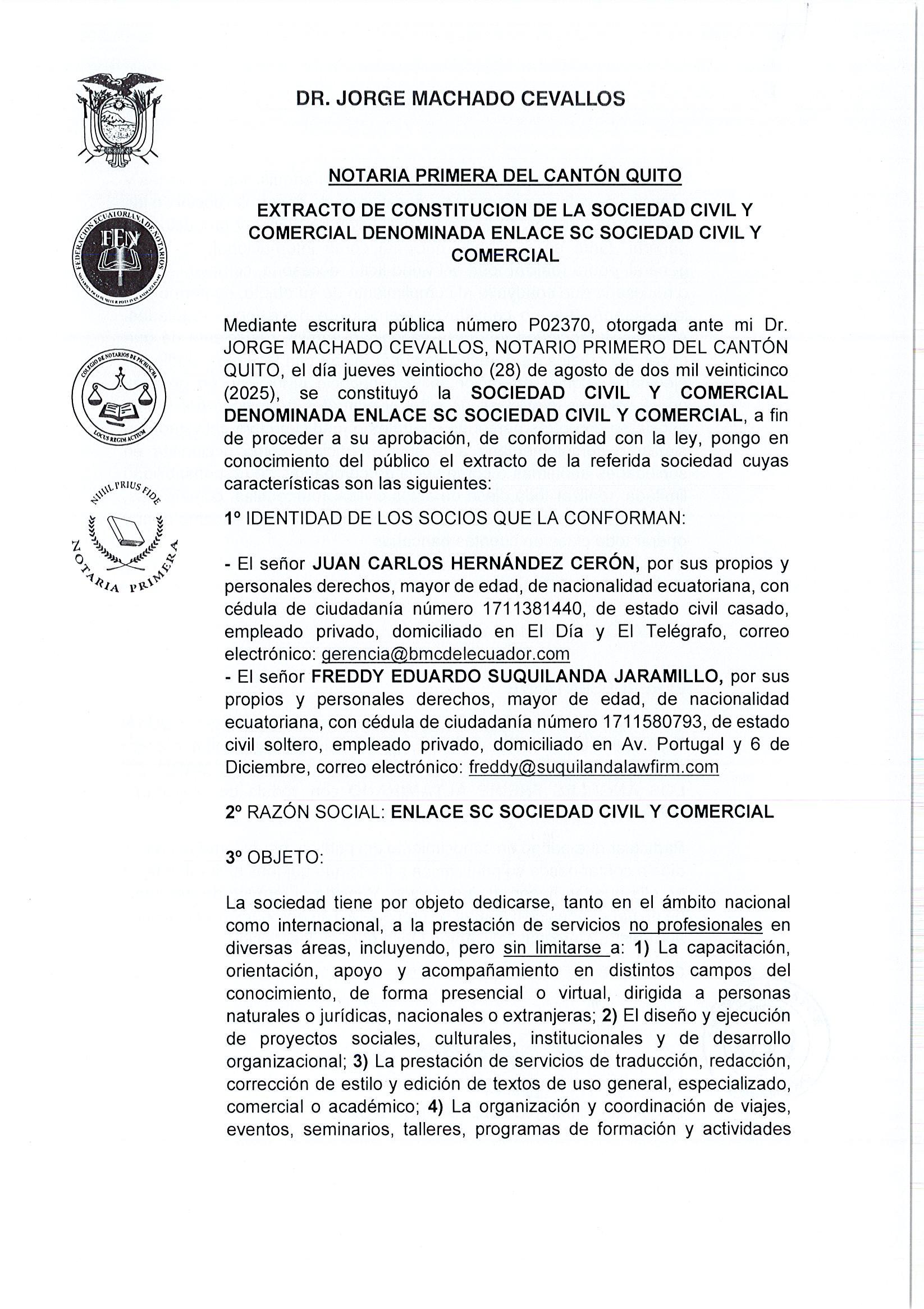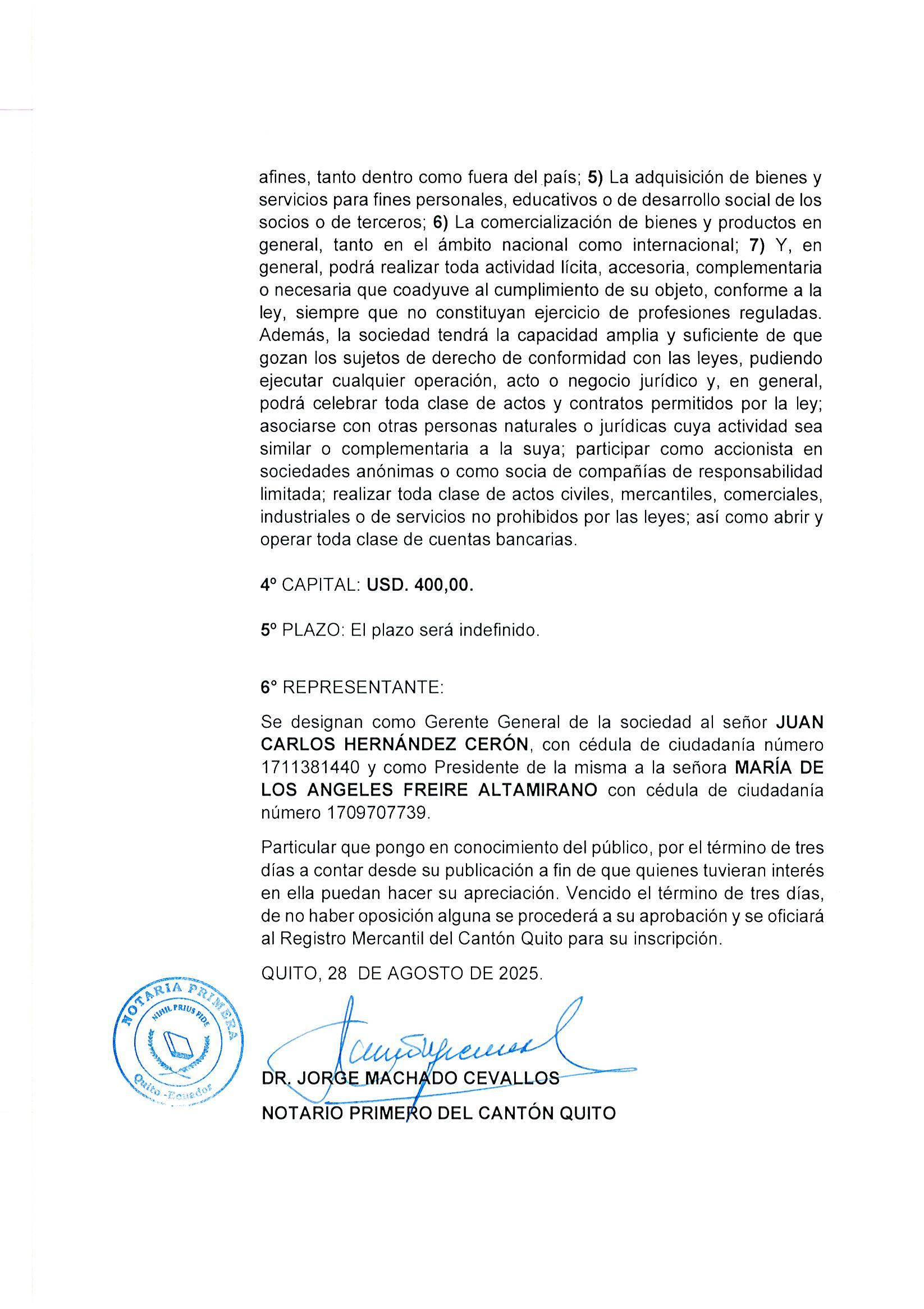 Se convoca de manera especial, personal e individualmente al Señor Portugal Pinchao Homero Luis con cedula de identidad N°1709334245, dirección domiciliaria en la Av. Eloy Alfaro y Calle Alfonso Altamirano, Presidente de la Compañía. Se pide a los socios-accionistas puntual asistencia.