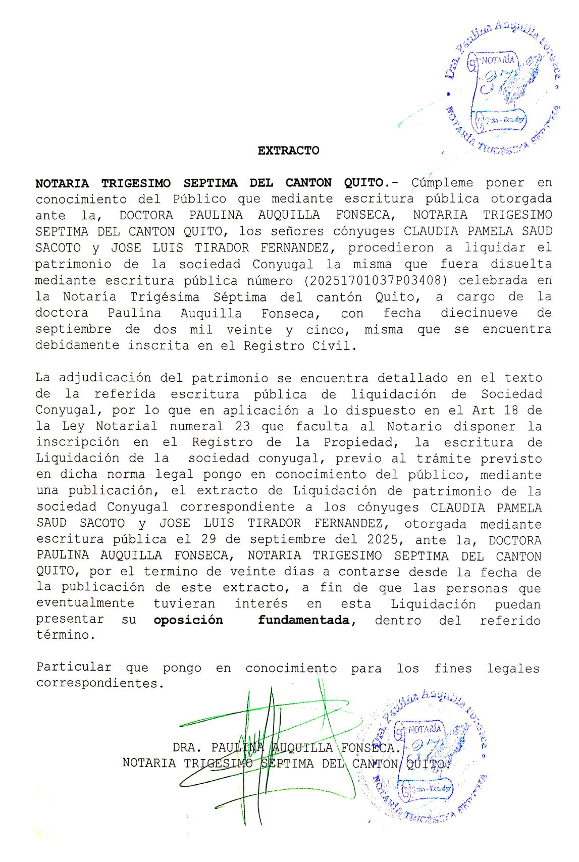 Razón: Siento por tal que en esta fecha se elabora el EXTRACTO el cual es enviado al casillero judicial No 3027; particular que pongo en su conocimiento para los fines legales pertinentes.- Quito 29 de septiembre del 2025.- CERTIFICO.