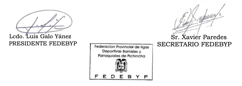 De conformidad con lo dispuesto en el Art.67, Art. 77 y Art. 78 de la Ley Orgánica del Deporte, Educación Física y la Recreación, se CONVOCA a los Presidentes de las filiales, a participar en la Asamblea General Ordinaria de la Federación Provincial de Ligas Deportivas Barriales y Parroquiales de Pichincha (FEDEBYP), que se llevará a cabo el día miércoles 25 de marzo del 2026, a las 17h00, en las oficinas de FEDEBYP, ubicadas en la Av. Luis Felipe Borja y Arenas, edificio Donofre, sexto piso, oficina 603, ciudad de Quito, D.M.