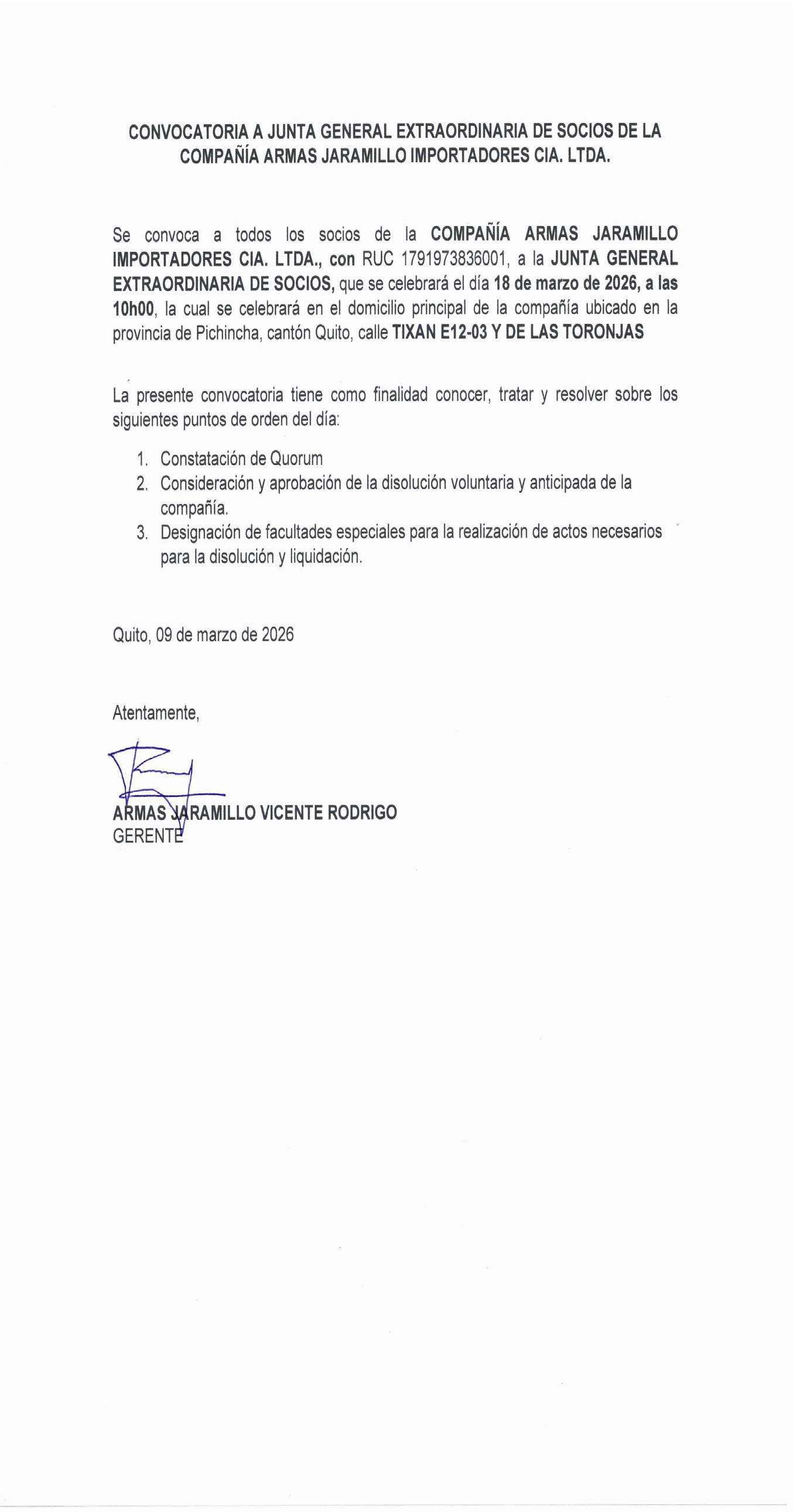 De conformidad con lo dispuesto en la Ley de Compañías, el Estatuto Social y demás normativa aplicable, se convoca a los señores Accionistas de la compañía a la JUNTA GENERAL ORDINARIA DE ACCIONISTAS, que se celebrará el día jueves 19 de marzo de 2026, a las 14h00, en la Casa Barrial de la Ciudadela Jacinto Collahuazo, primera etapa, cantón Otavalo, con el objeto de conocer y resolver sobre los siguientes puntos del orden del día: