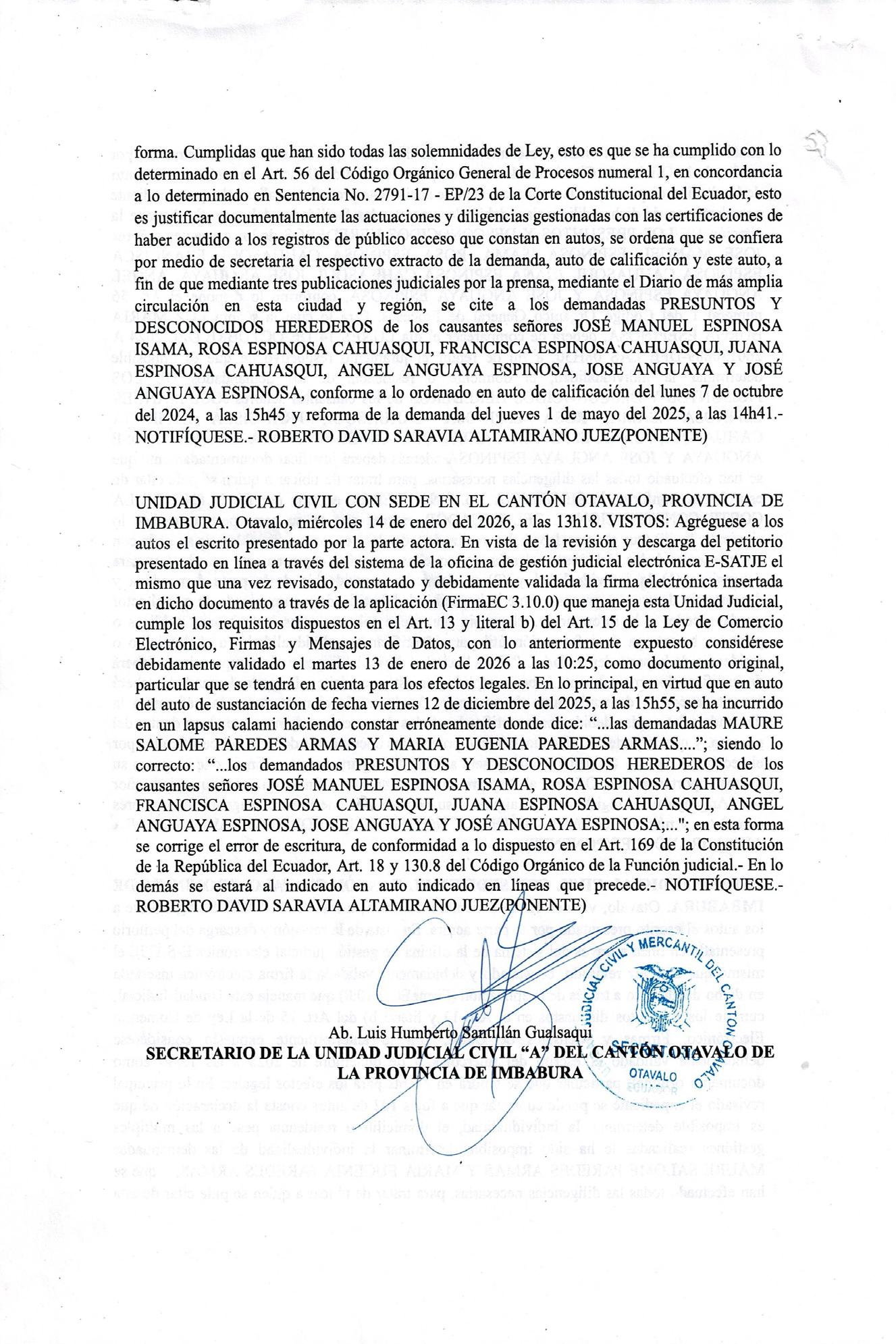 anteceder de declaración juramentada y certificado de movimiento migratorio extendido por el Ministerio de Relaciones Exteriores, realícese la citación por la prensa, con el libelo de la demanda y auto recaído, mediante PUBLICACIONES que se realizarán en tres fechas distintas, en un periódico de amplia circulación de la ciudad capital de la Provincia de Pichincha, por no contar en este cantón con dicho medio de comunicación escrita ; previniéndole a los citados de la obligación de comparecer a juicio, autorizar profesional del derecho y señalar dirección electrónica para recibir notificaciones; así mismo de dar contestación a la demanda dentro del término de treinta (30) días, de conformidad con los artículos 151 y 291 del COGEP; y, en el mismo acto deberá realizar anuncio o solicitud de pruebas, de conformidad con el artículo 152 del COGEP.- Cabe aclarar que el término concedido para contestar la demanda (de treinta días) empezará a decurrir, posteriores a los veinte días desde la última publicación efectivamente realizada; y, vencidos los mismos, con la contestación o en rebeldía se convocará a audiencia preliminar.- Esta disposición se emite, bajo prevenciones a la parte accionante de lo estipulado en el inciso final del Art. 56 del Código Orgánico General de Procesos, en caso de haberse faltado a la verdad con respecto a la individualidad y domicilio de los demandados.- La actuaria elabore el documento para la publicación señalada, el cual contendrá un extracto de la demanda o solicitud, auto de calificación y este auto.- Los gastos que genere la diligencia de citación serán de cuenta de la accionante, correspondiéndole el impulso y gestión del trámite y la incorporación al proceso de las publicaciones íntegras.- CUARTO.- De conformidad con lo preceptuado en la Disposición General Décima del Código Orgánico de Organización Territorial Autonomía y Descentralización, cuéntese en la presente causa con los señores VICTOR MIELES PALADINES Y PABLO CAIZA en sus calidades de Alcalde y Procurador Síndico del Gobierno Autónomo Descentralizado Municipal del cantón Puerto Quito a quienes se CITARÁ, en su despacho conocido por el señor actuario a la SECRETARÍA DE TIERRAS del Ministerio de Agricultura y ganadería mediante deprecatorio librado a la Unidad judicial de lo Civil del Complejo Norte de la Ciudad de Quito ofreciendo reciprocidad en casos análogos. QUINTO.- Téngase en cuenta los anticipos probatorios constantes en su demanda, los mismos que no se puede hacer interpretaciones por disposición expresa del art. 146 numeral cuarto del COGEP. SEXTO.- Oportunamente y previo al cumplimiento de la citación a los demandados se convocará a las partes a la diligencia de audiencia preliminar, diligencia a la cual las partes procesales deberán comparecer de manera personal o a través de procurador judicial dotado de poder suficiente para transigir, esto a fin de hacer efectivos los principios que rigen la oralidad de los procesos como son los de inmediación, simplificación, uniformidad, eficacia, celeridad, economía procesal, principio de humanidad en la aplicación del derecho, priorización de la equidad sobre la ritualidad del enjuiciamiento, principios consagrados en los artículos 169 de la Constitución, y artículo 18 del Código Orgánico de la Función Judicial. SÉPTIMO.- Tómese en cuenta la autorización conferida al Abogado Manuel Guartan así como las direcciones de correos electrónicos señalados en los memoriales para recibir notificaciones. (...) .- NOTIFÍQUESE Atentamente, Abg. Silvia Lorena Guamán Ramírez SECRETARIA UJMPQ