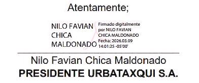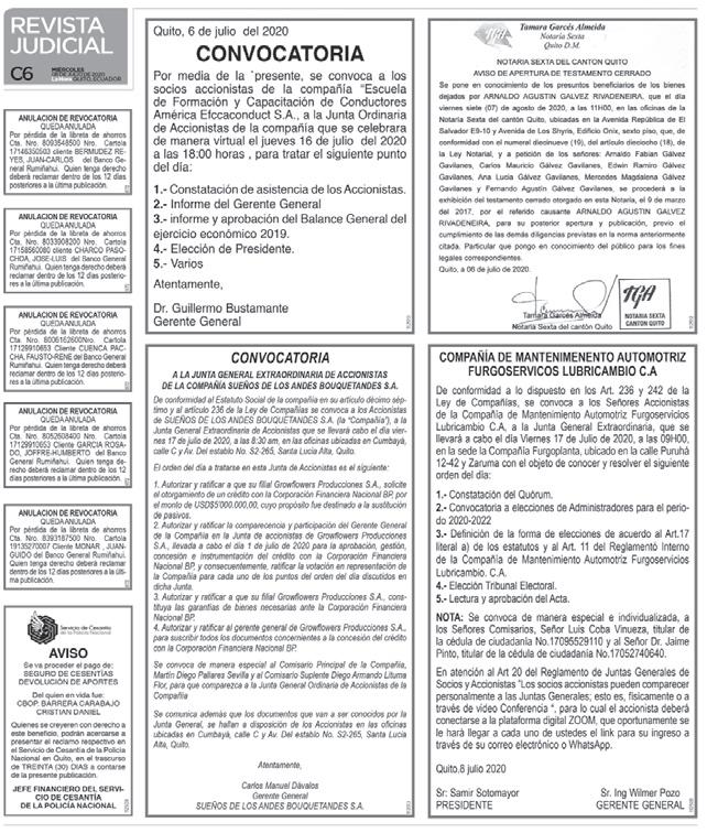 Información adicional: La documentación estará disponible en la oficina de la compañía. Los accionistas que deseen participar de forma virtual deberán solicitar su acceso. Se permitirá la representación mediante carta poder notariada. El quórum se conformará conforme a la Ley de Compañías y al estatuto social.