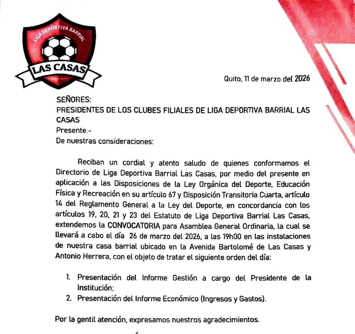 De conformidad a lo dispuesto en la Ley de Compañías, Al Reglamento de Juntas Generales de Socios y Accionistas de Compañías y el Estatuto Social de la Compañía, convoco a los señores Accionistas de la Compañía, COMPAÑIA DE TRANSPORTE TERRESTRE COMERCIAL DE CARGA LIVIANA CARLITRANS S.A. a la Junta General Ordinaria que tendrá lugar el viernes 20 de marzo del 2026, a las 11:00 am en el domicilio de la Compañía ubicado en la Calle Puerto Rico OE9-97 y Pasaje S/N en la ciudad de Quito.