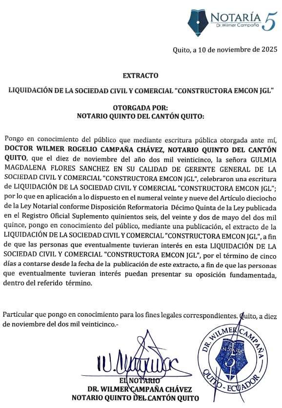 Dando cumplimiento a lo establecido en los Estatutos y en la Ley de Compañías, se convoca a los señores socios a la Junta General Extraordinaria de Socios y de acuerdo al Art. 238 de la Ley de Compañías, la Junta General Extraordinaria se llevará a cabo en la ciudad de Quito en la Av. 12 de Octubre N24-562 y Luis Cordero, Torre A, oficina 201-202, el día 28 de noviembre del 2025, a las 13:00 horas, para aprobar los nombramientos de Representante legal, Presidente de la compañía y asuntos varios.