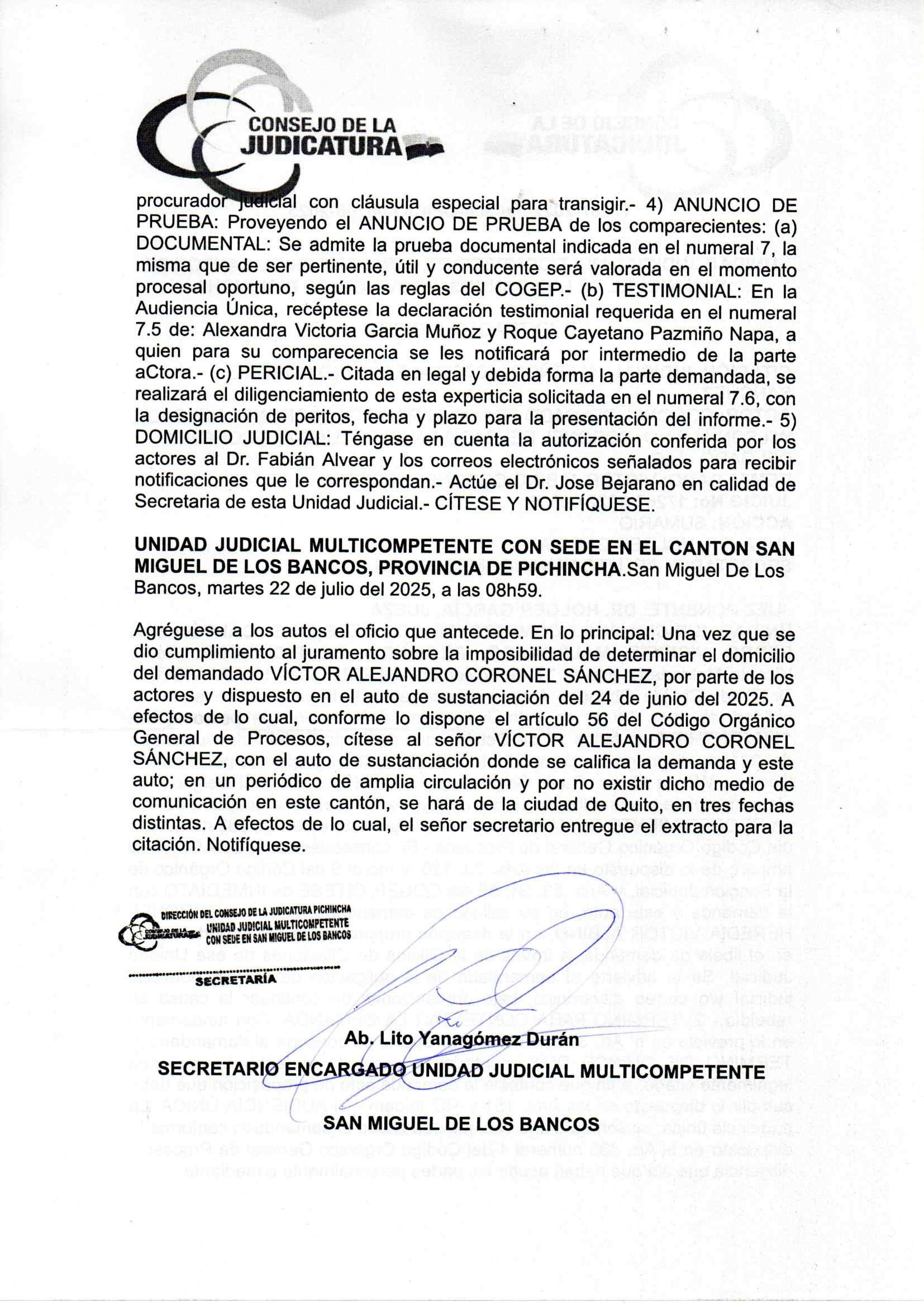 CITACIÓN JUDICIAL: AL SEÑOR VÍCTOR ALEJANDRO CORONEL SANCHEZ.