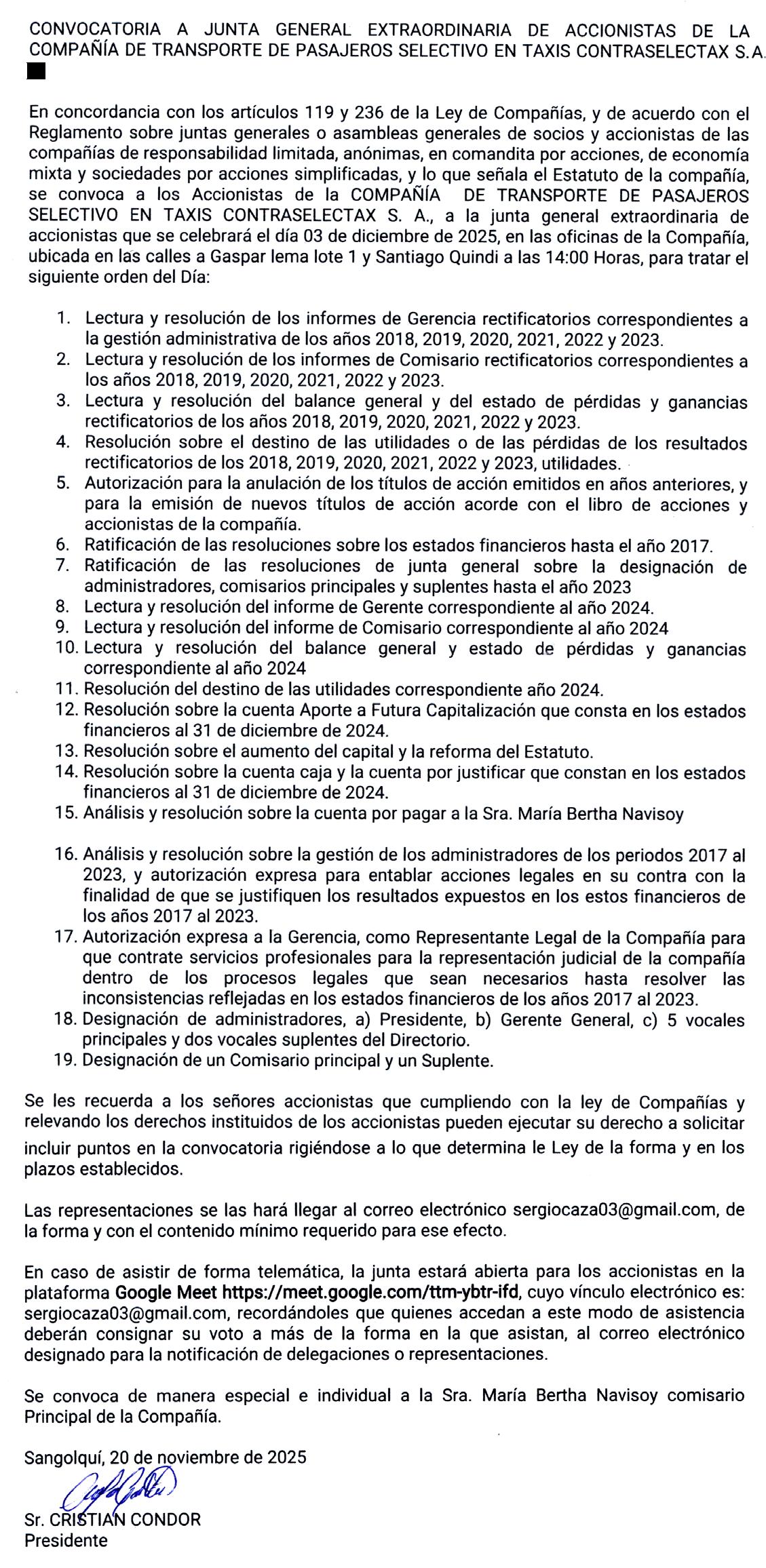 los señores DAVID EDUARDO SCHRECKINGER RODAS, y JENNY IVONNE ALVAREZ CULQUI, de estado civil casados entre sí, procedieron a autorizar la emancipación voluntaria de su hijo menor adulto NICOLAS EDUARDO SCHRECKINGER ALVAREZ, mayor de dieciséis (16) años, pero menor de dieciocho, el mismo que expresó su aceptación y consentimiento expreso de ser emancipado. La emancipación se encuentra detallada en el texto de la referida escritura pública de Emancipación de Menor de Edad, en la que se encuentra adjunto todos los documentos habilitantes, por lo que en aplicación a lo dispuesto en el numeral: 24 del Artículo: 18, de la Ley Notarial, en concordancia con el Artículo: 309 del Código Civil, en el que se faculta al Notario disponga la publicación de la autorización, por una sola vez en la prensa, cuya constancia de haberse publicado se incorporará en el protocolo, con lo cual entregará las copias respectivas para su inscripción en los registros de la Propiedad y Mercantil del cantón en el que se hubiere hecho la emancipación, previo al trámite previsto en dicha norma legal pongo en conocimiento del público, mediante una publicación, el extracto de la escritura pública de emancipación voluntaria del menor adulto NICOLAS EDUARDO SCHRECKINGER ALVAREZ, otorgada mediante escritura pública el cinco (05) de noviembre del dos mil veinticinco (2025), ante el suscrito Notario Doctor Cristhian Recalde De la Rosa NOTARIO SEXAGESIMO SEGUNDO DEL CANTON QUITO. Particular que pongo en conocimiento del público para los fines legales correspondientes. –