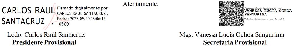 ra, del Legislativo, designados el 19 de septiembre de 2025 por el Consejo de Participación Ciudadana y Control Social (Cpccs), serán posesionados en la Asamblea Nacional este 23 de septiembre.