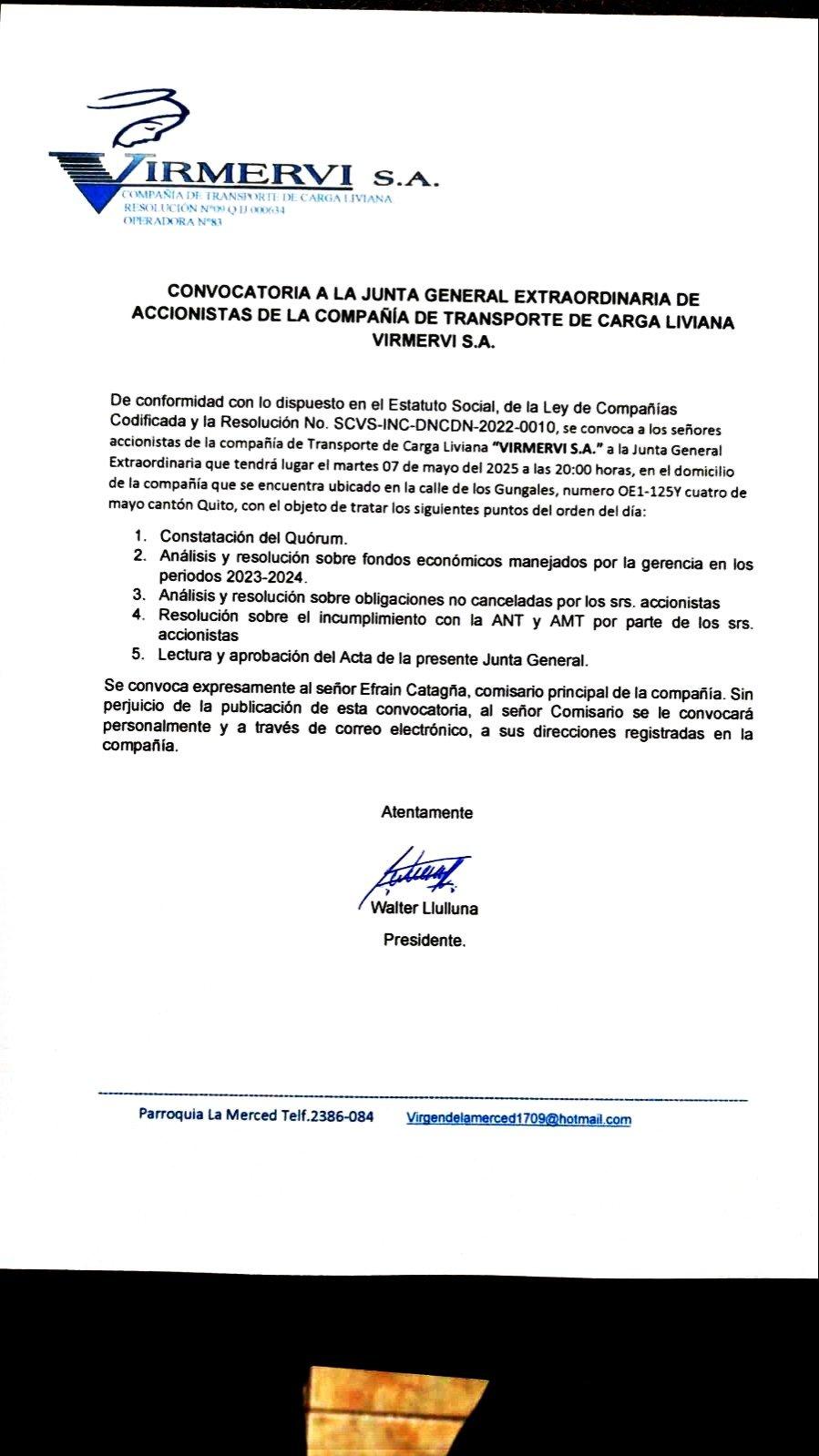 Los accionistas que deseen sugerir incluir puntos del orden del día adicionales a los señalados en esta convocatoria o correcciones a los mismos, lo harán dentro del plazo improrrogable de 72 horas, desde que se realizó el llamamiento a junta general de accionistas, de conformidad a lo establecido en el Art. 13 del Reglamento de juntas generales. De ser del caso, el derecho referido lo realizarán los socios al correo electrónico del presidente m.nacimba@hotmail.com como consta en los estatutos en caso de ausencia temporal o definitiva del gerente general asumirá las funciones el presidente.
