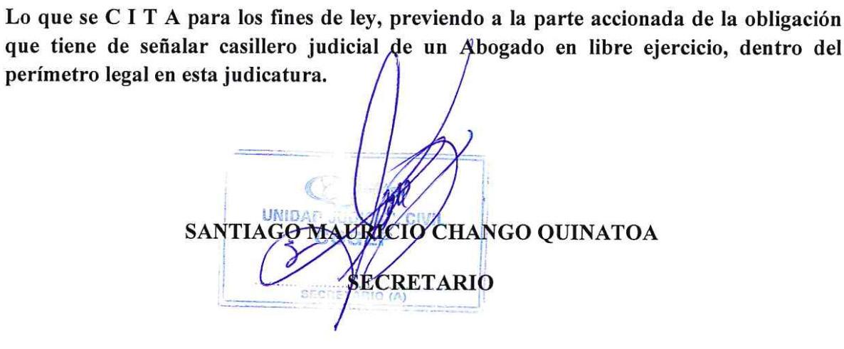 UNIDAD JUDICIAL CIVIL CON SEDE EN LA PARROQUIA IÑAQUITO DEL DISTRITO METROPOLITANO DE QUITO, PROVINCIA DE PICHINCHA. Quito, viernes 24 de febrero del 2023, a las 13h56. VISTOS: Agréguese al proceso el escrito presentado por los actores.- En tal virtud se considera: PRIMERO.- CALIFICACIÓN Y ADMISIÓN A TRÁMITE: Por cumplido el auto de sustanciación de fecha 25 de enero de 2021, se tiene que la demanda que antecede es clara, precisa y cumple con los requisitos formales de los artículos 142 y 143 del Código Orgánico General de Procesos (COGEP), por lo que se califica y admite a trámite mediante procedimiento Ordinario de conformidad con lo que determina el Art. 289 IBÍDEM.- SEGUNDO.- CÍTESE: a los demandados señores GAETANO MATEO SUESCUM PÉREZ DE ANDA, MARÍA SOLEDAD PÉREZ DE ANDA DÁVALOS en calidad de MANDATARIA DEL SEÑOR CARLOS FRANCISCO PÉREZ DE ANDA y CARLOS FRANCISCO SUESCUM PÉREZ DE ANDA en el lugar señalado, con la demanda, escrito que antecede y este auto, para el efecto envíese suficiente despacho a la oficina de citaciones.- TERCERO.- CONTESTACIÓN: De acuerdo a lo previsto en el artículo 291 IBIDEM, se concede a los demandados: GAETANO MATEO SUESCUM PÉREZ DE ANDA, MARÍA SOLEDAD PÉREZ DE ANDA DÁVALOS en calidad de MANDATARIA DEL SEÑOR CARLOS FRANCISCO PÉREZ DE ANDA y CARLOS FRANCISCO SUESCUM PÉREZ DE ANDA, el término de treinta días para que contesten la demanda en la forma establecida en el artículo 151 y siguientes del COGEP, debiendo anunciar todos los medios probatorios destinados a sustentar su contradicción. por cuanto se ha proporcionado la dirección de correo electrónico de la o del demandado, la o el juzgador ordenará también que se le haga conocer a la o al demandado, por correo electrónico, el extracto de la demanda y del auto inicial, de lo cual, se dejará constancia en el sistema. Esto no sustituye a la citación oficial.- CUARTO.- Precautelando la salud de todos los sujetos procesales, conforme lo determinado en el artículo 66 del Código Orgánico General de Procesos – COGEP que respecto a las notificaciones, en su parte pertinente establece: ”Son idóneos los siguientes lugares: el casillero judicial, domicilio judicial electrónico, correo electrónico de una o un defensor legalmente inscrito o el correo electrónico personal.”, todas las notificaciones en la presente causa se realizarán únicamente de forma electrónica a los correos o casilleros electrónicos que las partes han designado para el efecto. Adicionalmente se recuerda a las partes que a partir del 11 de mayo del 2020, con la resolución 045-2020 emitida por el Pleno del Consejo entró en vigencia el acceso al módulo externo por medio de la Oficina de Gestión Judicial Electrónica a través de la página web del Consejo de la Judicatura, por medio del cual los defensores técnicos de las partes pueden ingresar con sus credenciales, a fin de verificar el contenido de los escritos digitalizados, para su conocimiento.- Al amparo del artículo 14 de la Ley de Comercio Electrónico, Firmas Electrónicas y Mensajes de Datos, se indica que la firma electrónica contenida en el presente auto, tiene igual validez y genera los mismos efectos jurídicos que la firma manuscrita; en consecuencia, no será necesario consignar la firma manuscrita en la 197170679-DFE presente actuación judicial.- CÍTESE Y NOTIFÍQUESE.- UNIDAD JUDICIAL CIVIL CON SEDE EN LA PARROQUIA IÑAQUITO DEL DISTRITO METROPOLITANO DE QUITO, PROVINCIA DE PICHINCHA. Quito, jueves 6 de marzo del 2025, a las 14h31. VISTOS.- Agréguese al proceso el acta de diligencia que antecede.- PRIMERO.- De conformidad con lo previsto en el Art. 56 del Código Orgánico General de Procesos, cuya disposición se encuentra vigente de manera inmediata, cítese a la parte demandada MARÍA SOLEDAD PÉREZ DE ANDA DÁVALOS, por la prensa, mediante tres publicaciones realizadas en uno de los periódicos de mayor circulación que se editan en esta ciudad; para cuyo efecto, por Secretaría, confiérase el extracto respectivo.- SEGUNDO.- Precautelando la salud de todos los sujetos procesales, conforme lo determinado en el artículo 66 del Código Orgánico General de Procesos – COGEP que respecto a las notificaciones, en su parte pertinente establece: ”Son idóneos los siguientes lugares: el casillero judicial, domicilio judicial electrónico, correo electrónico de una o un defensor legalmente inscrito o el correo electrónico personal.”, en concordancia con la Resolución No. 102-2023, emitida por el Pleno del Consejo de la Judicatura, mediante la cual se resuelve priorizar las notificaciones electrónicas de todas las actuaciones judiciales, se notifica de forma electrónica al domicilio legal señalado por las partes, el presente auto. Al amparo del artículo 14 de la Ley de Comercio Electrónico, Firmas Electrónicas y Mensajes de Datos, se indica que la firma electrónica contenida en el presente auto, tiene igual validez y genera los mismos efectos jurídicos que la firma manuscrita; en consecuencia, no será necesario consignar la firma manuscrita en la presente actuación judicial.- NOTIFÍQUESE f) ALTAMIRANO RUIZ SANTIAGO DAVID, JUEZ.