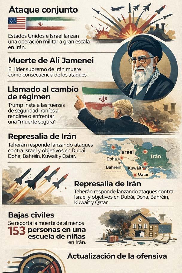El ayatolá Alí Jamenei, líder supremo en Irán desde 1989, murió tras un ataque de Estados Unidos e Israel, el sábado 28 de febrero. Aunque en la guerra de 12 días en junio de 2025 Israel destruyó gran parte de su arsenal militar, Irán respondió bombardeando Baréin, Kuwait, Omán, Qatar, Arabia Saudita y Emiratos Árabes Unidos.