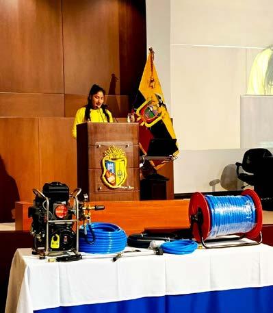 En el encuentro también se presentó el funcionamiento de una bomba portátil de alta presión de 6.5 caballos de fuerza, uno de los equipos entregados para fortalecer las labores en terreno. El dispositivo permite transportar agua desde fuentes cercanas y distribuirla mediante