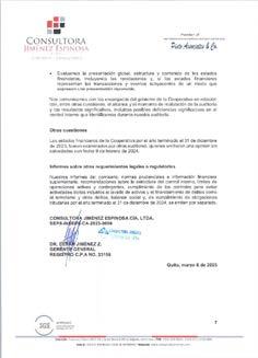 La Administración de la Cooperativa es responsable por la preparación y presentación razonable de los estados financieros adjuntos, de conformidad con las regulaciones, normas y prácticas contables establecidas por la Junta de Política y Regulación Financiera, Junta de Política y Regulación Monetaria y Superintendencia de Economía Popular y Solidaria y del control interno que la administración considere necesario para permitir la preparación de los estados financieros libres de errores materiales, debido a fraude o error.