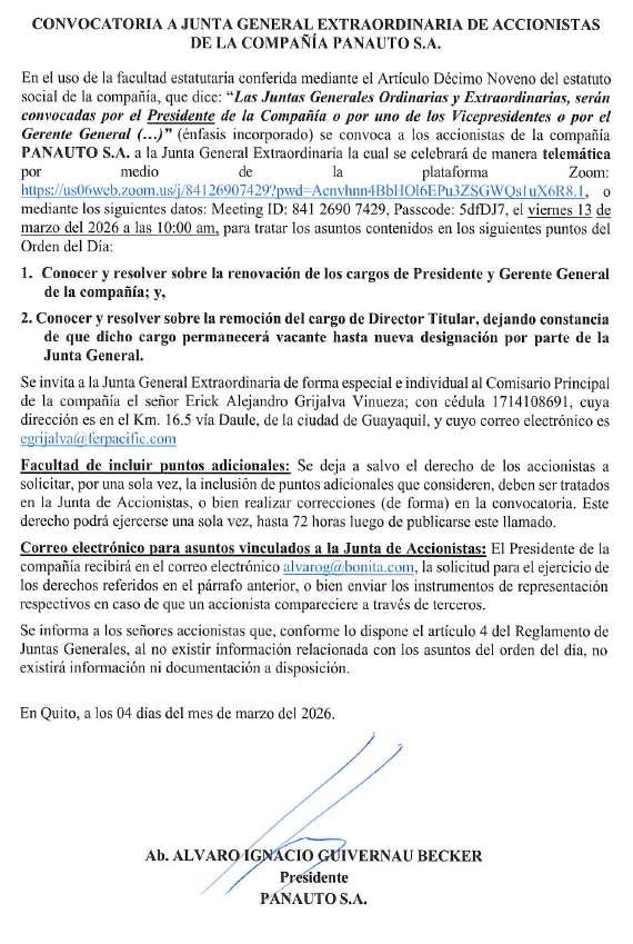 Se convoca a todos los accionistas de la COMPAÑÍA DE TRANSPORTES EXPRESSJOSUE DE POMASQUI S.A, a la JUNTA GENERAL ORDINARIA DE ACCIONISTA, con el carácter obligatorio que se realizará el día Martes 17 de marzo de 2026, a las 14H00, en el domicilio de la compañía ubicado en la parroquia Pomasqui, calle Ignacio Carrasco N1-93 y Marieta de Veintimilla, de este cantón Quito provincia de Pichincha, para tratar el siguiente orden del día: