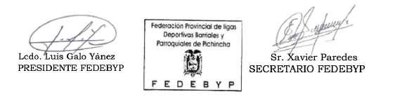 De conformidad con lo dispuesto en el Art.67, inciso cuarto, de la Ley Orgánica del Deporte, Educación Física y la Recreación y del Art. 19, literal d), del Estatuto de la Federación Provincial de Ligas Deportivas Barriales y Parroquiales de Pichincha (FEDEBYP), se CONVOCA a los Presidentes de las filiales, o su delegado debidamente acreditado, a participar en la Asamblea General Ordinaria de la Federación Provincial de Ligas Deportivas Barriales y Parroquiales de Pichincha (FEDEBYP), que se llevará a cabo el día viernes 13 de marzo del 2026, a las 17h00, en las oficinas de FEDEBYP, ubicadas en la Av. Luis Felipe Borja y Arenas, edificio Donofre, sexto piso, oficina 603, ciudad de Quito, D.M.