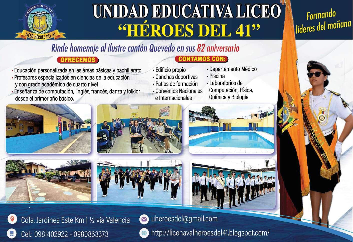 La Unidad Educativa Liceo Héroes del 41, ubicada en Quevedo, comenzó a funcionar oficialmente el 12 de noviembre de 2012, tras obtener el permiso del Ministerio de Educación. Su creación fue impulsada por un grupo de profesionales quevedeños, el Máster Bolívar Yépez, en conjunto con un amigo oficial de la Armada Nacional, con la visión de ofrecer una educación integral y de calidad.