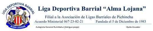 Por medio del presente, se convoca con carácter OBLIGATORIO a los presidentes y/o representantes de los clubes jurídicos (2 delegados por club) a las elecciones generales de la LIGA DEPORTIVA BARRIAL Y PARROQUIAL “ALMA LOJANA” periodo 2025 – 2029, a llevarse a cabo el sábado 18 de octubre de 2025 a las 16:00 (4pm) en nuestra sede social ubicada en la Urbanización Alma Lojana, Autopista General Rumiñahui (Antiguo Peaje), con el siguiente orden del día: