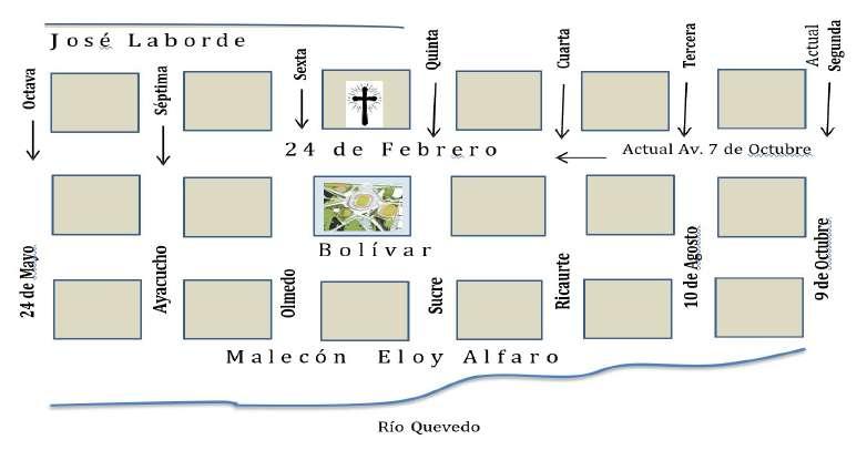 Croquis de Quevedo y la nomenclatura de sus primeras calles. de cemento en el Malecón, que no duró mucho, a la altura de esta calle Ricaurte. Sigue la nomenclatura a la siguiente calle con el nombre de “Sucre”, en honor a Antonio José de Sucre.