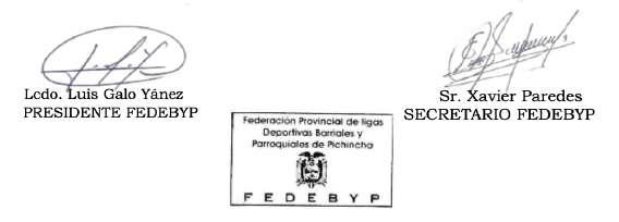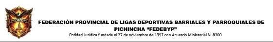 De conformidad con lo dispuesto en el Art.67, Art. 77 y Art. 78 de la Ley Orgánica del Deporte, Educación Física y la Recreación, se CONVOCA a los Presidentes de las filiales, a participar en la Asamblea General Ordinaria de la Federación Provincial de Ligas Deportivas Barriales y Parroquiales de Pichincha (FEDEBYP), que se llevará a cabo el día miércoles 25 de marzo del 2026, a las 17h00, en las oficinas de FEDEBYP, ubicadas en la Av. Luis Felipe Borja y Arenas, edificio Donofre, sexto piso, oficina 603, ciudad de Quito, D.M.