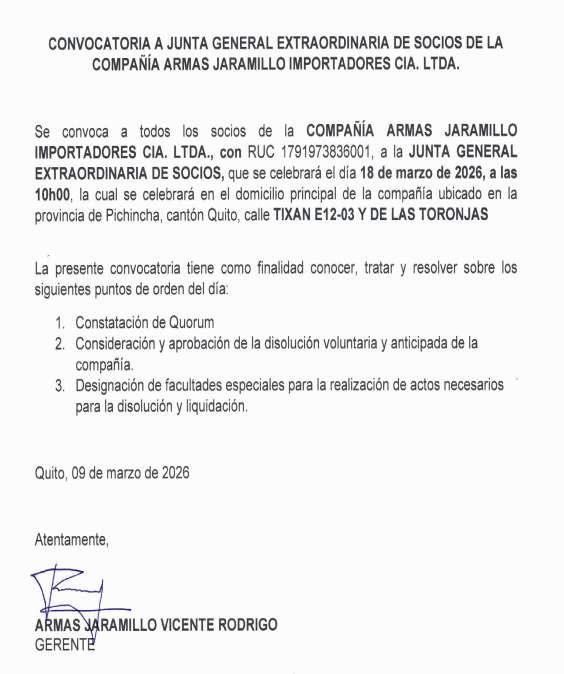 De conformidad con lo dispuesto en la Ley de Compañías, el Estatuto Social y demás normativa aplicable, se convoca a los señores Accionistas de la compañía a la JUNTA GENERAL ORDINARIA DE ACCIONISTAS, que se celebrará el día jueves 19 de marzo de 2026, a las 14h00, en la Casa Barrial de la Ciudadela Jacinto Collahuazo, primera etapa, cantón Otavalo, con el objeto de conocer y resolver sobre los siguientes puntos del orden del día: