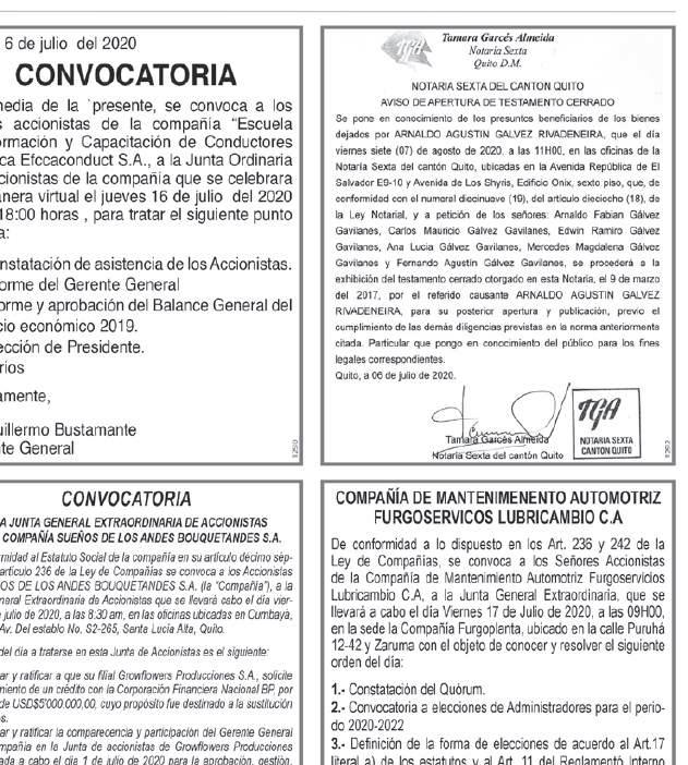 De conformidad con lo dispuesto en el artículo 236 de la Ley de Compañías, y en concordancia con lo establecido en los artículos 12 y 14 del Estatuto Social vigente, se convoca a los señores accionistas de la COMPAÑÍA DE TAXIS CONVENCIONALES TAXIMUNDO S.A. a la Junta General Ordinaria de Accionistas, que se llevará a efecto el día martes 31 de marzo de 2026, a las 10h00, en el auditorio de la Iglesia Centro Cristiano Vida Abundante, ubicado en las calles Los Cedros OE1-103 y Av. Galo Plaza Lasso, con el objeto de tratar el siguiente: