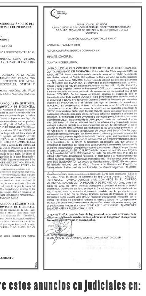 TREJO,, Por reunir los requisitos legales previstos en los artículos 142 y 143 del Código Orgánico General de Procesos, por lo que de conformidad con el Art. 146 inciso primero del mismo cuerpo legal, se califica la demanda de clara, precisa y completa, consecuentemente, se acepta a trámite mediante PROCEDIMIENTO SUMARIO , cuyo extracto dice lo siguiente: Pongo en su conocimiento que mi extinta madre