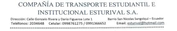 CONVOCATORIA A JUNTA GENERAL ORDINARIA DE ACCIONISTAS DE LA COMPAÑÍA DE TRANSPORTE ESTUDIANTIL E INSTITUCIONAL “ESTURIVAL S.A. con domicilio en la provincia de Pichincha, Cantón Rumiñahui, Parroquia Sangolquí, calle Gonzalo Rivera y Darío Figueroa Lote 1.