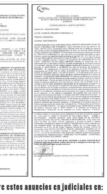 UNIDAD JUDICIAL MULTICOMPETENTE CIVIL CON SEDE EN EL CANTÓN MEJÍA, PROVINCIA DE PICHINCHA.- Mejia, jueves 8 de agosto del 2019, las 16h01, VISTOS: Avoco conocimiento de la presente causa en calidad de Juez Titular de esta Judicatura.-Una vez que se ha dado cumplimiento a lo requerido en el auto inmediato anterior.- FUNDAMENTOS DE HECHO.- ÚNICO: Con respecto a la demanda de prescripción adquisitiva de dominio presentada por CEBALLOS JOSE EZEQUIAS y ANAGUANO MARTHA DEL ROSARIO, en contra de ESTEBAN JOSÉ EDUARDO MIÑO CAJIAO, ROQUE ANTONIO MIÑO CAJIAO, MARIA AUGUSTA MIÑO CAJIAO, SUSANA DE LAS MERCEDES MIÑO CAJIAO, RODRIGO ANDRÉS FRANCISCO MIÑO CAJIAO, y ÁLVARO SANTIAGO MIÑO CAJIAO, se considera: FUNDAMENTOS DE DERECHO.- PRIMERO: Examinada la demanda, se estima en base a los documentos , datos aportados y fundamentos de hecho y de derecho, que es clara, precisa y reúne los requisitos establecidos en el Art. 142 del Código Orgánico General de Procesos .- PARTE DISPOSITIVA.- En base a lo anterior este Judicatura resuelve: PRIMERO: Admitir a trámite la presente demanda de prescripción adquisitiva de dominio, que deberá sustanciarse por las reglas del procedimiento ordinario.- Como ordena el artículo 291 inciso segundo del Código Orgánico General de Procesos dese traslado de la demanda, a la parte demandada, haciéndole entrega de la copia de demanda y copias certificadas de los documentos y anexos acompañados, emplazándola para que conteste en el término de treinta días y haga uso de su derecho a la defensa en los términos establecidos en el Art. 151 del COGEP.- Apercíbase a la parte demandada, que si no comparece dentro del término señalado, se le declarará en rebeldía procesal.- Advirtiéndose, que la actuación en el proceso deberá ser a través de un profesional del derecho, asimismo señalar casilla judicial y/o correo electrónico.- SEGUNDO: DE LA PRUEBA .- En cuanto a la prueba anunciada, se estará a lo previsto en los artículos 160, 161, 190, y 294.7, literal d) del COGEP, sobre la admisibilidad y práctica de la prueba en la respectiva Audiencia.- Al tenor de lo dispuesto en el artículo 169 tercer inciso Ibídem, se ordena a las partes que pongan a disposición de la respectiva contraparte las pruebas que estén o deban estar en su poder.- En cuanto a la prueba testimonial, solicitada se estará, a lo dispuesto en el Art. 191 del COGEP..- TERCERO: Previa a la citación de la presente demanda y en cumplimiento a lo dispuesto en el Art. 146 inciso quinto, se dispone la inscripción de la presente demanda en el Registro de la Propiedad del cantón Mejía, en el bien inmueble cuyas características constan en el certificado adjunto a la demanda.- CUARTO: Atento al juramento rendido por los actores señores CEBALLOS JOSE EZEQUIAS y ANAGUANO MARTHA DEL ROSARIO, y conforme lo establece el Art. 56 numeral 1 del Código Orgánico General de Procesos, cítese a los herederos desconocidos de MARIA LUISA CAJIAO MIÑO mediante publicaciones en uno de los diarios de mayor circulación de la ciudad de Quito,(capital de la provincia de Pichincha) en virtud de que no se cuenta con este medio de comunicación en esta localidad, advirtiéndoles de la obligación que tienen de señalar casilla judicial y/o correo electrónico para sus posteriores notificaciones. QUINTO.- Cítese a los demandados señores ESTEBAN JOSÉ EDUARDO MIÑO CAJIAO, ROQUE ANTONIO MIÑO CAJIAO, MARIA AUGUSTA MIÑO CAJIAO, SUSANA DE LAS MERCEDES MIÑO CAJIAO, RODRIGO ANDRÉS FRANCISCO MIÑO CAJIAO, y ÁLVARO SANTIAGO MIÑO CAJIAO, en el domicilio señalado en el libelo de demanda, así como también cítese al señor PROCURADOR GENERAL DEL ESTADO, para el efecto, DEPREQUESE a uno de los señores Jueces de la Unidad Judicial de lo Civil, de la parroquia de Iñaquito, del Distrito Metropolitano de Quito, Provincia de Pichincha, en casos análogos, a quienes se les hará conocer el contenido de la demanda, este auto y copias certificadas adjuntas, ofreciendo reciprocidad en casos análogos.- Cítese al, GOBIERNO AUTÓNOMO DESCENTRALIZADO MUNICIPAL DEL CANTÓN MEJÍA en los personeros del Alcalde y Procurador Síndico, en el domicilio señalado en el libelo de demanda, a través de la oficina de citaciones de esta Unidad Judicial.- CUARTO: NOTIFICACIONES Y AUTORIZACIÓN.-Tómese nota de la casilla judicial y correo electrónico señalados por los accionantes así como la autorización conferida a sus Abogados Patrocinadores.Actué el Ab. Wilson Pastuña, en calidad de Secretario Encargado de esta Judicatura, con acción de personal Nro. 4918-DP17-2019-MP.- Notifíquese, cúmplase, cítese y publíquese.-f) Dr. Bustos Avila Rolando Alcibar.-Juez.