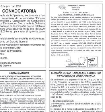La Junta se realizará el 20 de marzo del 2026, a las 10h00 en el domicilio de la compañía, ubicado en la provincia de Orellana, Ciudad Francisco de Orellana, en la Calle Ambato S/N, intersección Calle Río Negro, Frente a la Iglesia San Antonio. Para conocer y resolver el siguiente orden del día: