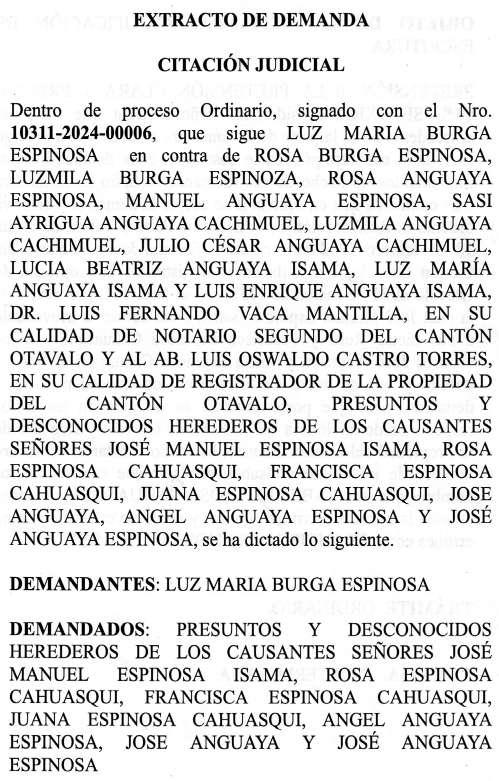 anteceder de declaración juramentada y certificado de movimiento migratorio extendido por el Ministerio de Relaciones Exteriores, realícese la citación por la prensa, con el libelo de la demanda y auto recaído, mediante PUBLICACIONES que se realizarán en tres fechas distintas, en un periódico de amplia circulación de la ciudad capital de la Provincia de Pichincha, por no contar en este cantón con dicho medio de comunicación escrita ; previniéndole a los citados de la obligación de comparecer a juicio, autorizar profesional del derecho y señalar dirección electrónica para recibir notificaciones; así mismo de dar contestación a la demanda dentro del término de treinta (30) días, de conformidad con los artículos 151 y 291 del COGEP; y, en el mismo acto deberá realizar anuncio o solicitud de pruebas, de conformidad con el artículo 152 del COGEP.- Cabe aclarar que el término concedido para contestar la demanda (de treinta días) empezará a decurrir, posteriores a los veinte días desde la última publicación efectivamente realizada; y, vencidos los mismos, con la contestación o en rebeldía se convocará a audiencia preliminar.- Esta disposición se emite, bajo prevenciones a la parte accionante de lo estipulado en el inciso final del Art. 56 del Código Orgánico General de Procesos, en caso de haberse faltado a la verdad con respecto a la individualidad y domicilio de los demandados.- La actuaria elabore el documento para la publicación señalada, el cual contendrá un extracto de la demanda o solicitud, auto de calificación y este auto.- Los gastos que genere la diligencia de citación serán de cuenta de la accionante, correspondiéndole el impulso y gestión del trámite y la incorporación al proceso de las publicaciones íntegras.- CUARTO.- De conformidad con lo preceptuado en la Disposición General Décima del Código Orgánico de Organización Territorial Autonomía y Descentralización, cuéntese en la presente causa con los señores VICTOR MIELES PALADINES Y PABLO CAIZA en sus calidades de Alcalde y Procurador Síndico del Gobierno Autónomo Descentralizado Municipal del cantón Puerto Quito a quienes se CITARÁ, en su despacho conocido por el señor actuario a la SECRETARÍA DE TIERRAS del Ministerio de Agricultura y ganadería mediante deprecatorio librado a la Unidad judicial de lo Civil del Complejo Norte de la Ciudad de Quito ofreciendo reciprocidad en casos análogos. QUINTO.- Téngase en cuenta los anticipos probatorios constantes en su demanda, los mismos que no se puede hacer interpretaciones por disposición expresa del art. 146 numeral cuarto del COGEP. SEXTO.- Oportunamente y previo al cumplimiento de la citación a los demandados se convocará a las partes a la diligencia de audiencia preliminar, diligencia a la cual las partes procesales deberán comparecer de manera personal o a través de procurador judicial dotado de poder suficiente para transigir, esto a fin de hacer efectivos los principios que rigen la oralidad de los procesos como son los de inmediación, simplificación, uniformidad, eficacia, celeridad, economía procesal, principio de humanidad en la aplicación del derecho, priorización de la equidad sobre la ritualidad del enjuiciamiento, principios consagrados en los artículos 169 de la Constitución, y artículo 18 del Código Orgánico de la Función Judicial. SÉPTIMO.- Tómese en cuenta la autorización conferida al Abogado Manuel Guartan así como las direcciones de correos electrónicos señalados en los memoriales para recibir notificaciones. (...) .- NOTIFÍQUESE Atentamente, Abg. Silvia Lorena Guamán Ramírez SECRETARIA UJMPQ