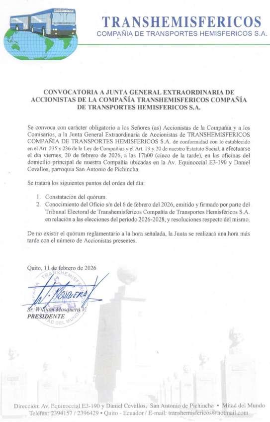 De conformidad con las disposiciones de la Ley de Compañías y el Art. Décimo Novenos de los Estatutos de la empresa se convoca a los señores accionistas de la Compañía de Transporte en Furgonetas COTRAFUR S.A. a la Junta General Extraordinaria, la misma que tendrá lugar el día miércoles 18 de febrero del 2026 a las 18H00 en la oficina de la compañía ubicada en la calle Riofrio Oe1-20 y Av. 10 de Agosto (Edifico Oficinas Quito) del Distrito Metropolitano de Quito, para tratar el siguiente orden del día: