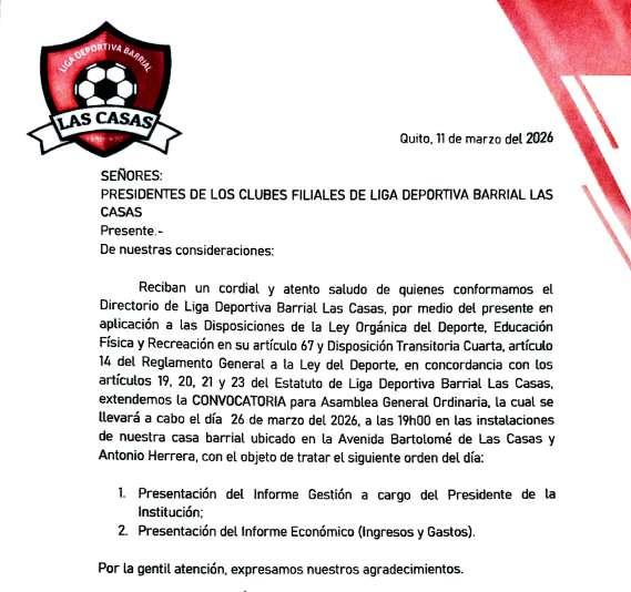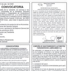 De conformidad a lo dispuesto en la Ley de Compañías, Al Reglamento de Juntas Generales de Socios y Accionistas de Compañías y el Estatuto Social de la Compañía, convoco a los señores Accionistas de la Compañía, COMPAÑIA DE TRANSPORTE TERRESTRE COMERCIAL DE CARGA LIVIANA CARLITRANS S.A. a la Junta General Ordinaria que tendrá lugar el viernes 20 de marzo del 2026, a las 11:00 am en el domicilio de la Compañía ubicado en la Calle Puerto Rico OE9-97 y Pasaje S/N en la ciudad de Quito.