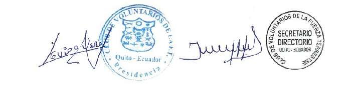 EL PRESIDENTE DEL DIRECTORIO DEL C V F T “CABO NICANOR QUIROZ SALAZAR”, EN USO DE SUS ATRIBUCIONES Y EN CUMPLIMIENTO A LOS ARTÍCULOS 15 LITERAL B), 20, 21, 22, 23 LITERALES A), B) y D), 35 LITERAL A); Y, 36 LITERALES D) y E) DEL ESTATUTO EN VIGENCIA; ARTÍCULOS 20 INCISIO 1 Y 21 DEL REGLAMENTO PARA LA APLICACIÓN DEL ESTATUTO; Y, RESOLUCIÓN ADOPTADA POR EL DIRECTORIO, CONVOCA A LA ASAMBLEA GENERAL ORDINARIA DE SOCIOS, QUE SE REALIZARÁ EN LAS INSTALACIONES DEL HOTEL OCEAN BLUE, FILIAL DEL CVFT, UBICADO EN LA PARROQUIA CRUCITA, PROVINCIA DE MANABÍ; Y, A TRAVÉS DE LA PLATAFORMA ZOOM, EL DÍA MIÉRCOLES 18 DE MARZO DE 2026, A LAS 08H00, MODALIDAD MIXTA (PRESENCIAL Y TELEMÁTICA) QUE TIENE PLENA VALIDEZ JURÍDICA Y SE ENCUENTRA PERMITIDA POR LA NORMATIVA VIGENTE QUE RIGE AL CLUB; PARA TRATARSE EL SIGUIENTE ORDEN DEL DÍA: