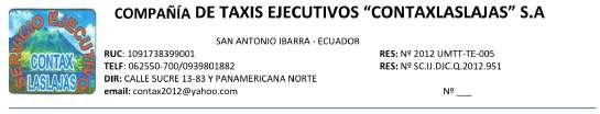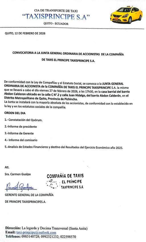 Dando cumplimiento a lo estipulado en la ley de la Superintendencia de Compañías y los reglamentos internos de la Compañía de Taxis Ejecutivos Virgen de las Lajas CONTAXLASLAJAS S.A., mediante la presente se CONVOCA, a una Junta General Ordinaria de Accionistas, a realizarse el día Miércoles 25 de Febrero del 2026 a las 16:00pm en la sede de la Compañía, ubicada en la parroquia de San Antonio de Ibarra, calle Sucre 13-83 y Panamericana para tratar el siguiente orden del día: