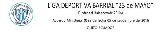De conformidad con las disposiciones estatutarias, se convoca a los clubes jurídicos filiales de la LIGA DEPORTIVA BARRIAL 23 DE MAYO, a la Asamblea General de Elecciones, que se celebrará el día 10 de febrero de 2026, a partir de las 20:00 en la dirección: Calle CARLOS BONILLA Y RAFAEL GARCIA –S 35-45, Barrio 23 DE MAYO, perteneciente a la parroquia de 23 DE MAYO, CANTON QUITO, PROVINCIA PICHINCHA, para tratar el siguiente Orden del día: