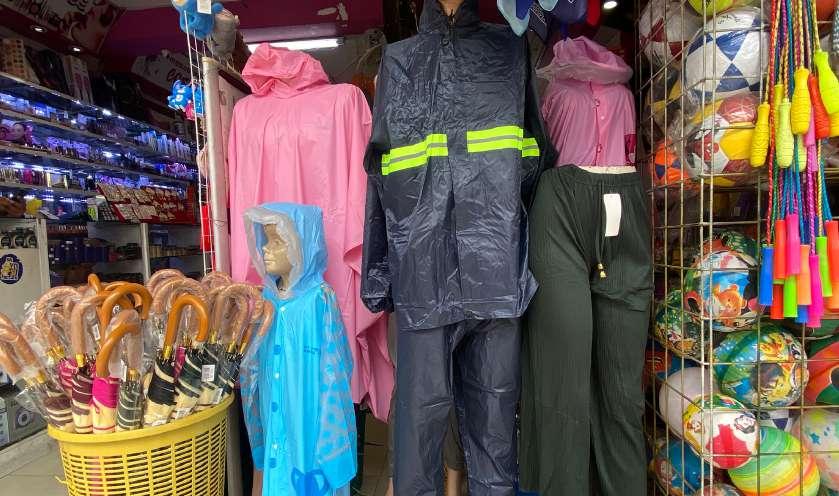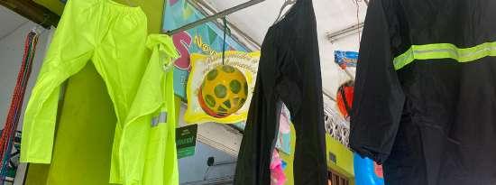 Entre los productos más solicitados están los ponchos impermeables, que se ofrecen desde 7 dólares, así como conjuntos completos que incluyen pantalón y