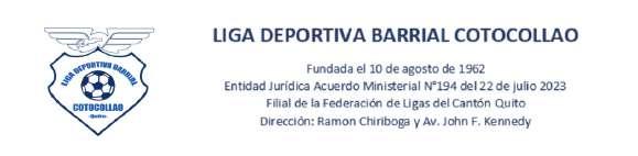 De conformidad al Art. 28 de nuestro Estatuto se convoca con el carácter de obligatorio a los clubes filiales de Liga Deportiva Barrial Cotocollao, a la Asamblea General Extraordinaria, que se realizará el día martes 10 de febrero del 2026 a las 19:30 horas, en la sala de sesiones de nuestra Institución, con el fin de tratar el siguiente orden del día: