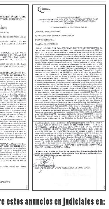 EXTRACTO DE AVISO DE CITACION JUDICIAL AL PUBLICO GENERAL DENTRO DEL EXPEDIENTE DE DEMARCACION DE LINDEROS, que sigue LILIA MARIA SANCHEZ SANCHEZ en contra de ZOILA MARIA MORALES BARRETO, MERCEDES NARCISA MORALES BARRETO, VERONICA DOLORES MORALES BARRETO y MARCELO JAVIER MORALES BARRETO, JOSE RAMÓN MORALES BARRETO, MANUEL ANTONIO MORALES BARRETO Y SANTIAGO ANDRÉS MORALES BARRETO; cítese cite a los demandados los señores MORALES BARRETO MANUEL ANTONIO y MORALES BARRETO VERONICA DOLORES, mediante publicaciones que se realizarán en uno de los Diarios de mayor circulación a nivel nacional, en tres días distintos, en un periódico de amplia circulación que se editan en la ciudad de Quito, Provincia de Pichincha.