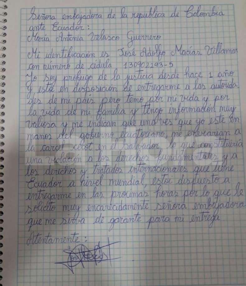 “Señora embajadora de la República de Colombia ante Ecuador: María Antonia Velazco Guerrero (…) Mi identificación es José Adolfo Macías Villamar (…) yo soy prófugo de la justicia desde hace un año y estoy en disposición de entregarme a las autoridades de mi país, pero temo por mi vida y por la vida de mi familia (…)”, dice la misiva. Fito señala en la carta su intención de que la diplomática sea garante en la entrega y detalla que no quiere ser enviado a una cárcel de El Salvador. La misiva fue entregada, pero las negociaciones no se concretaron. El grupo de negociación de Fito aseguró haber conversado con gente de esa sede diplomática, pero luego dejaron de dar
