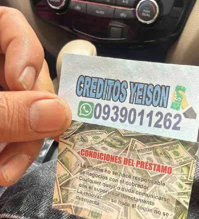 En las calles de ese sector se encontraron tarjetas de tipo presentación, que ofertan este ‘servicio’ con un número telefónico para contactarse. “Te prestamos dinero rápido. Único requisito es tener negocio propio”, destaca una de las tarjetas. En otra de las tarjetas mues-