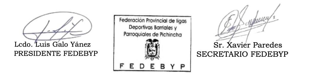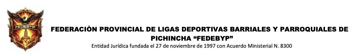 De conformidad con lo dispuesto en el Art.67, inciso cuarto, de la Ley Orgánica del Deporte, Educación Física y la Recreación y del Art. 19, literal d), del Estatuto de la Federación Provincial de Ligas Deportivas Barriales y Parroquiales de Pichincha (FEDEBYP), se CONVOCA a los Presidentes de las filiales, o su delegado debidamente acreditado, a participar en la Asamblea General Ordinaria de la Federación Provincial de Ligas Deportivas Barriales y Parroquiales de Pichincha (FEDEBYP), que se llevará a cabo el día viernes 13 de marzo del 2026, a las 17h00, en las oficinas de FEDEBYP, ubicadas en la Av. Luis Felipe Borja y Arenas, edificio Donofre, sexto piso, oficina 603, ciudad de Quito, D.M.